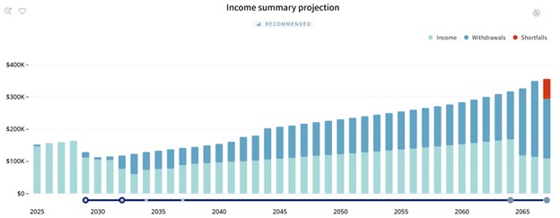 Consider this example – you are looking at an income projection for a couple in their mid-50s wishing to retire at 60 which for most is aggressive. It doesn’t take a doctorate in finance to see what the chart is telling us. Red is not great news. In this scenario, they end up running out of savings in their early 80s and relying on their various pensions.