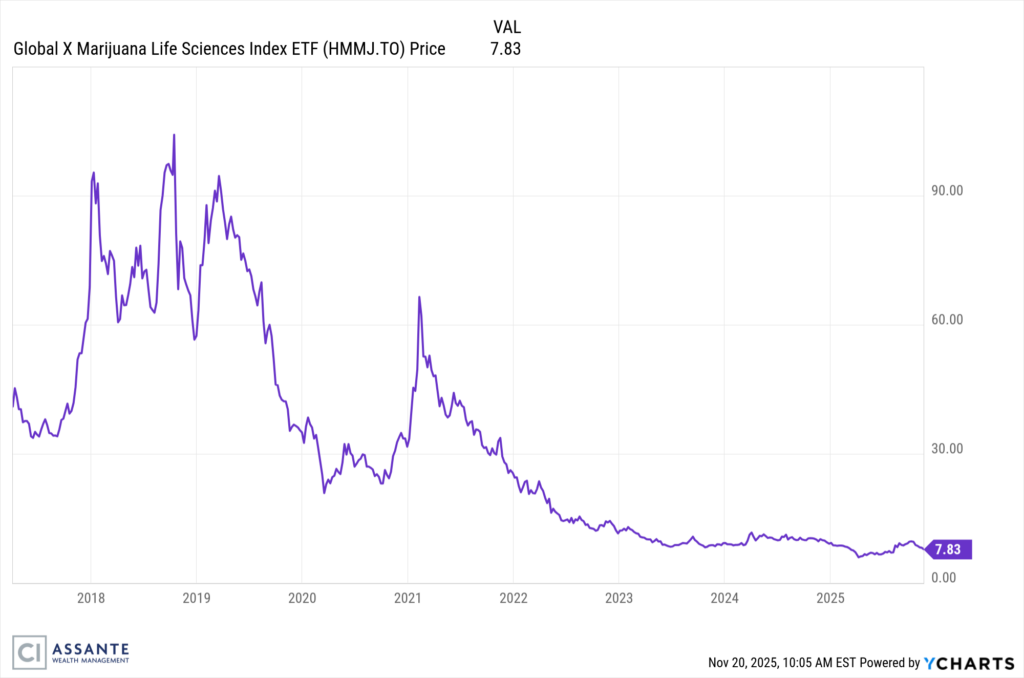 The Marijuana Life Sciences Index zoomed upward - then reality tapped the brakes - and never let go. Prices collapsed by 90% with many investors never recovering.